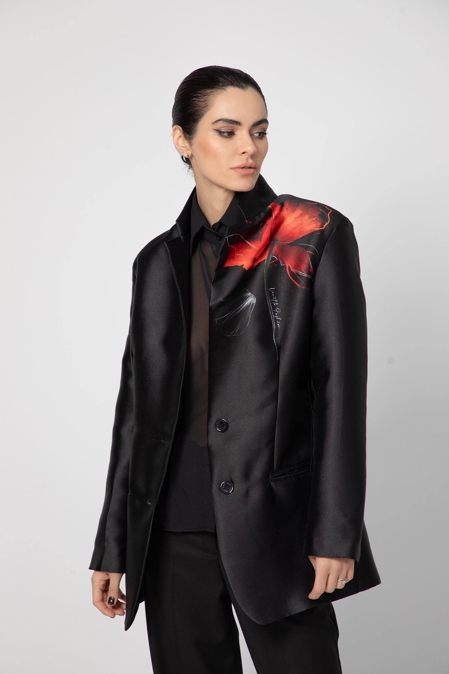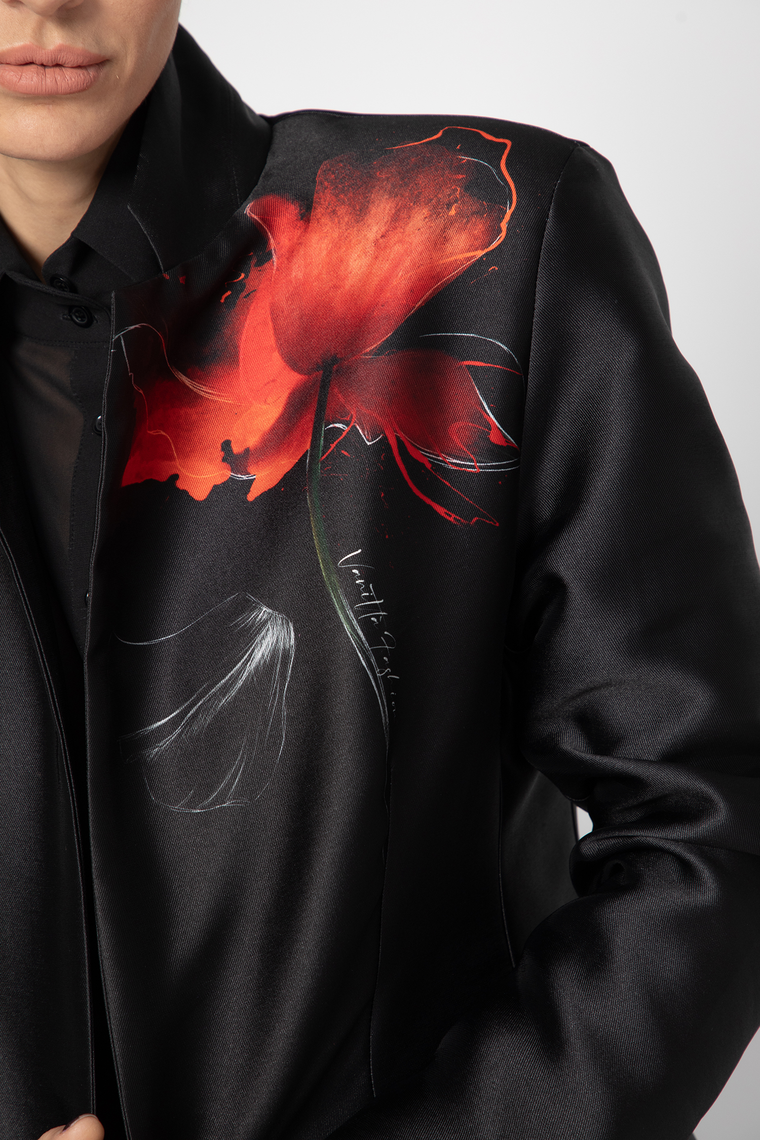 Красиво и елегантно сако, изработено от авторски плат с флорален елемент.