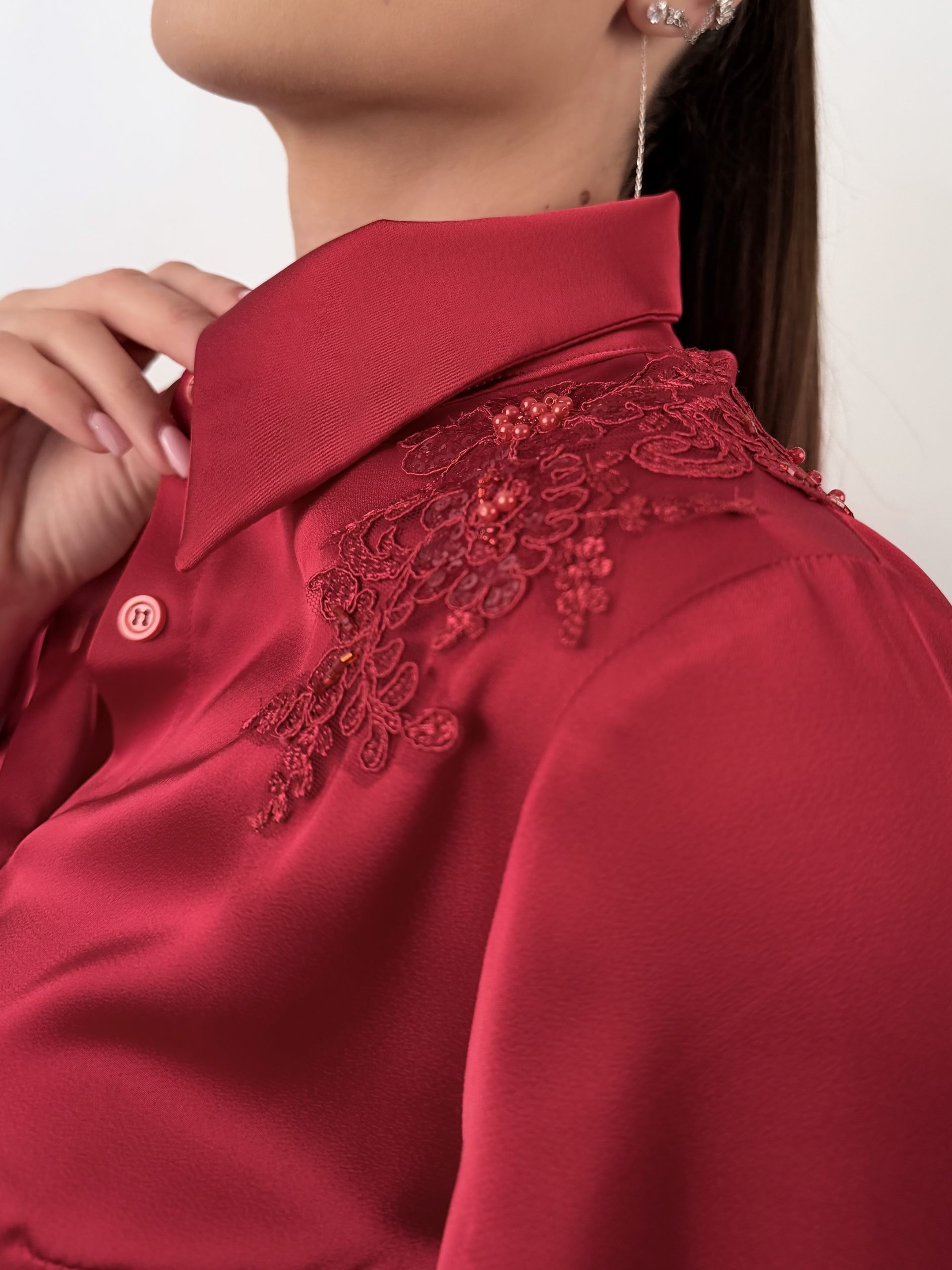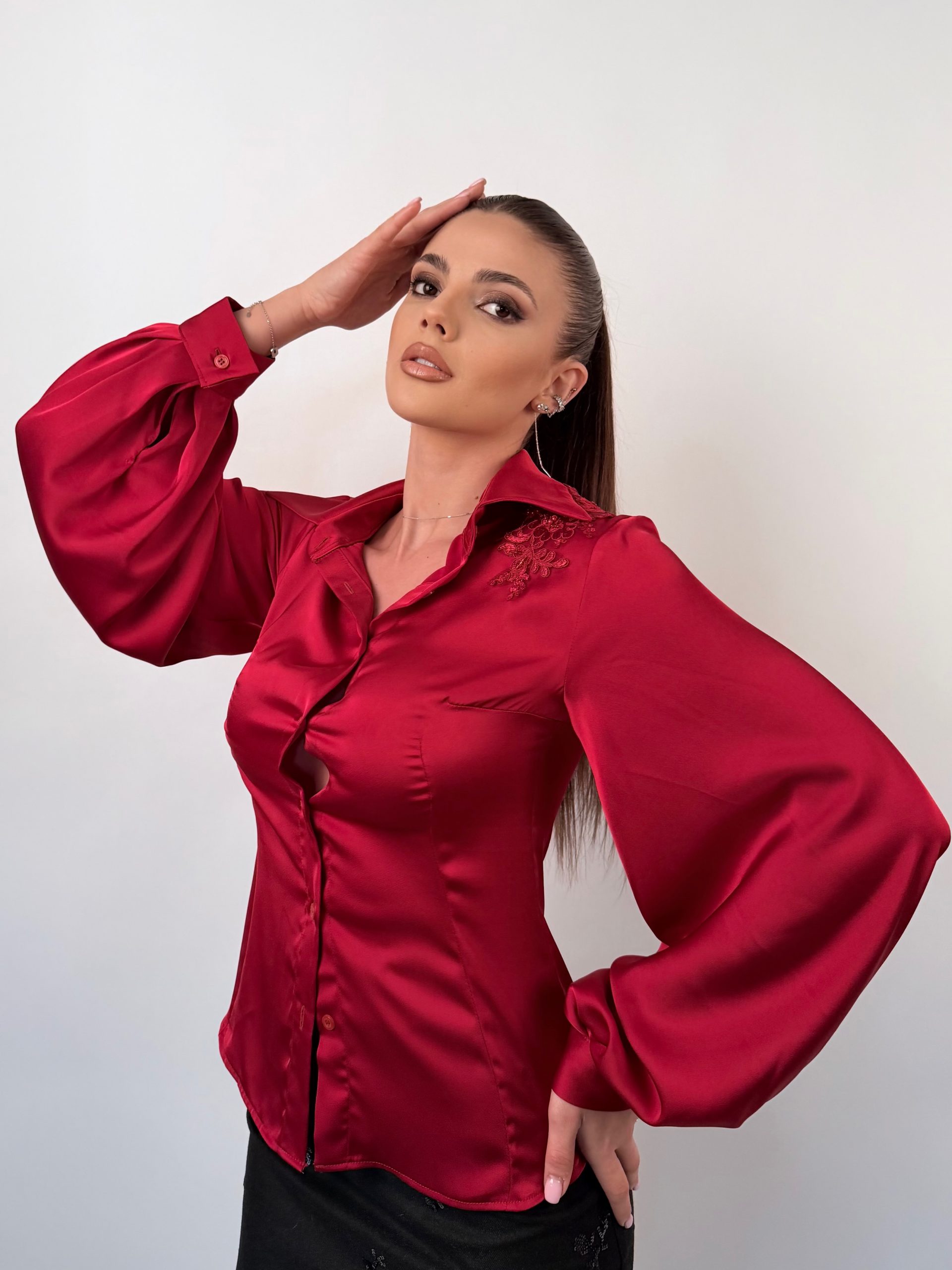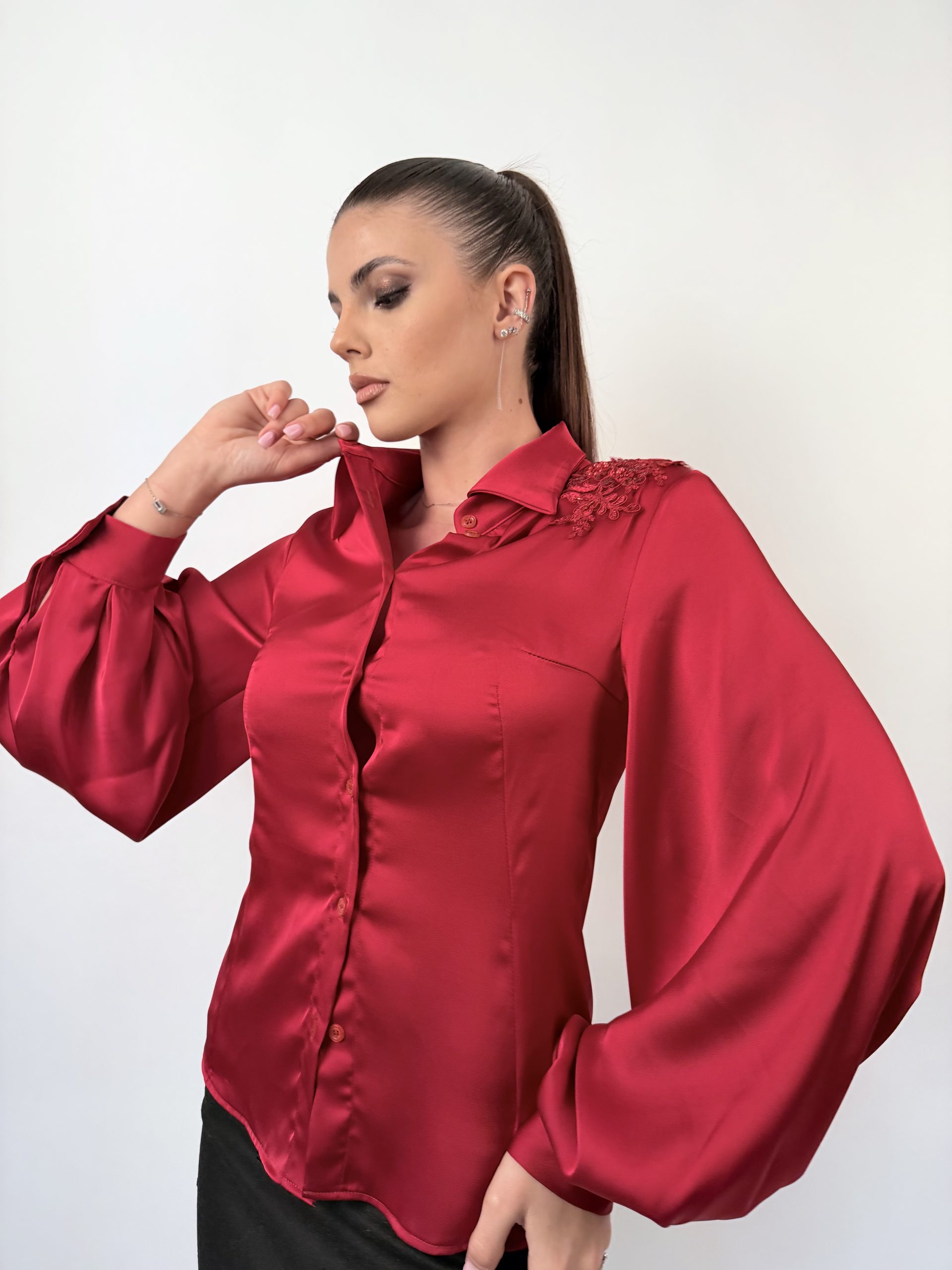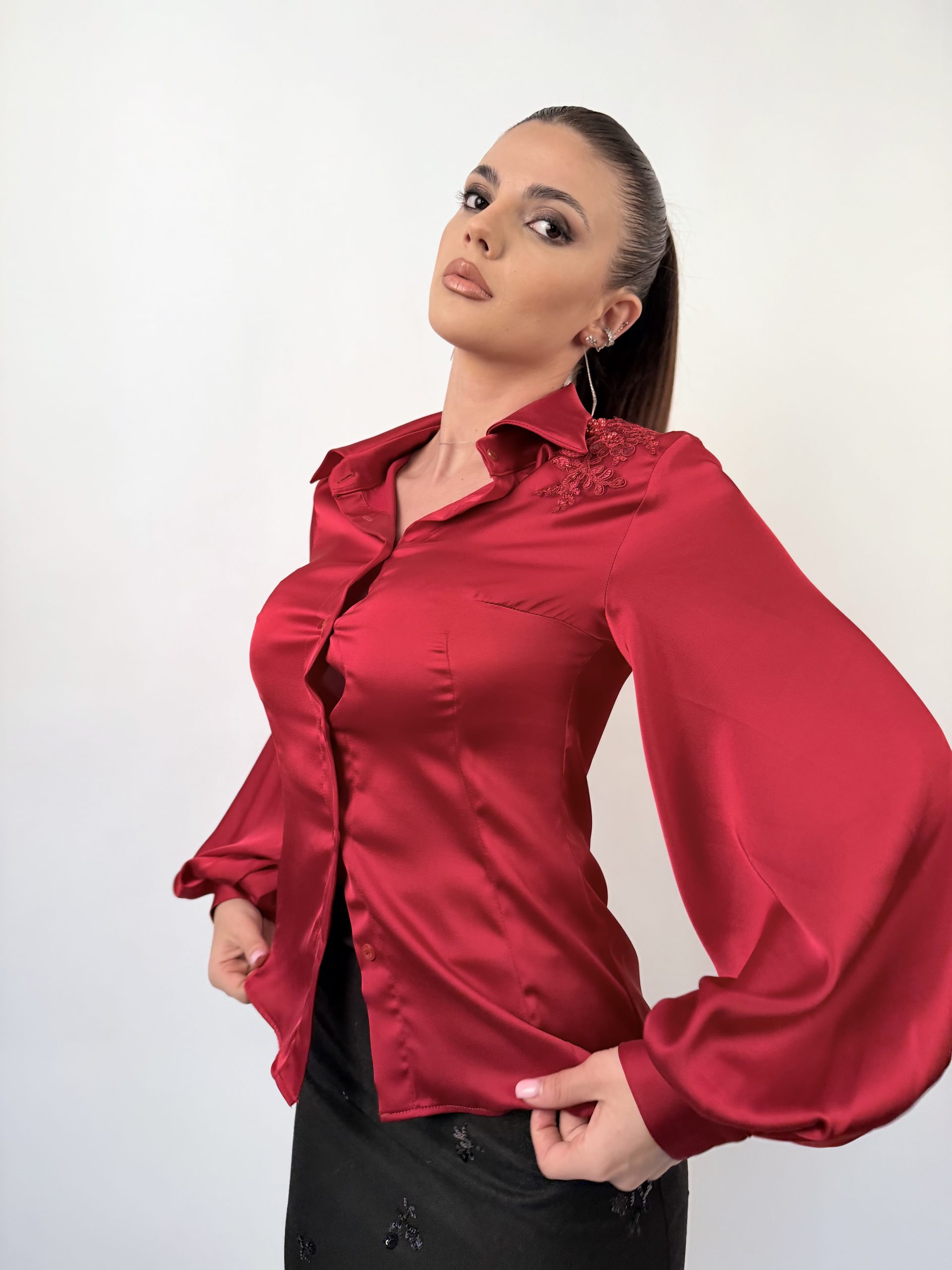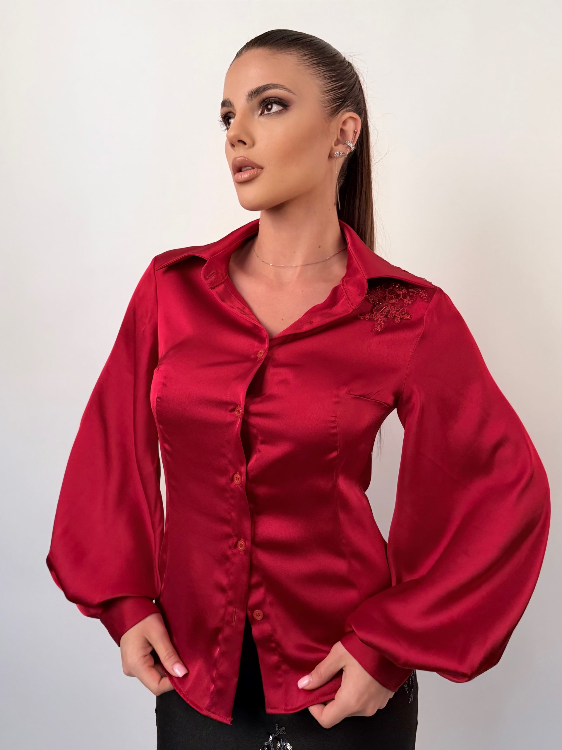 Красива риза, изработена от висококачествен тежкопадащ сатен, който придава лукс и елегантност на всеки силует. Моделът впечатлява с богат, обемен ръкав и изящна декорация на рамото от бляскави елементи, добавящи фин блясък и изисканост. Перфектен избор за официална, стилна и впечатляваща визия.