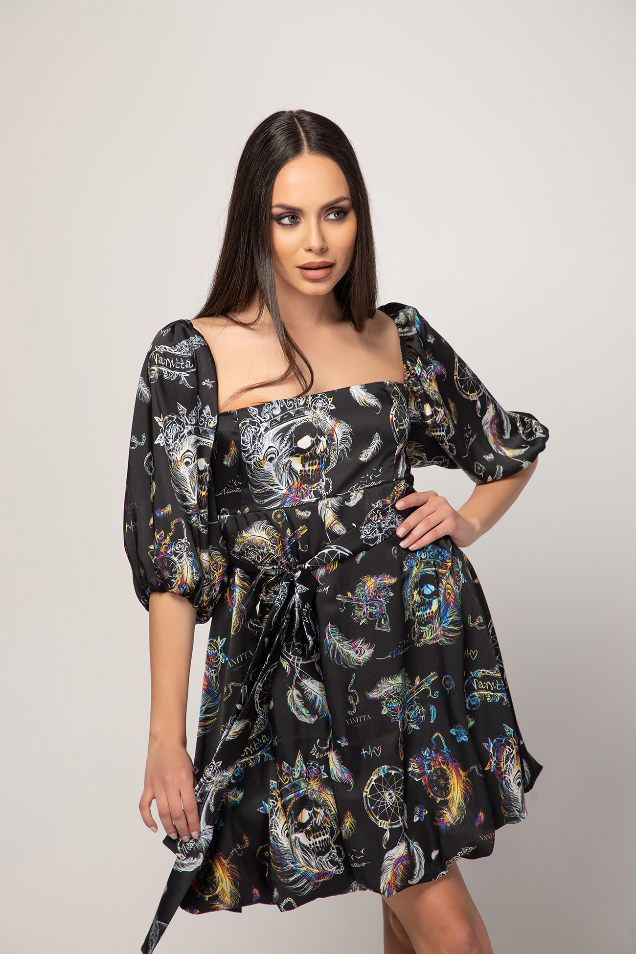 Невероятно красива дамска рокля от ефектен дизайнерски плат. Богати ръкави с ластик, деколте тип бюстие. Роклята е с кройка тип- балон, връзки на гърба и елегантен еластичен набор.