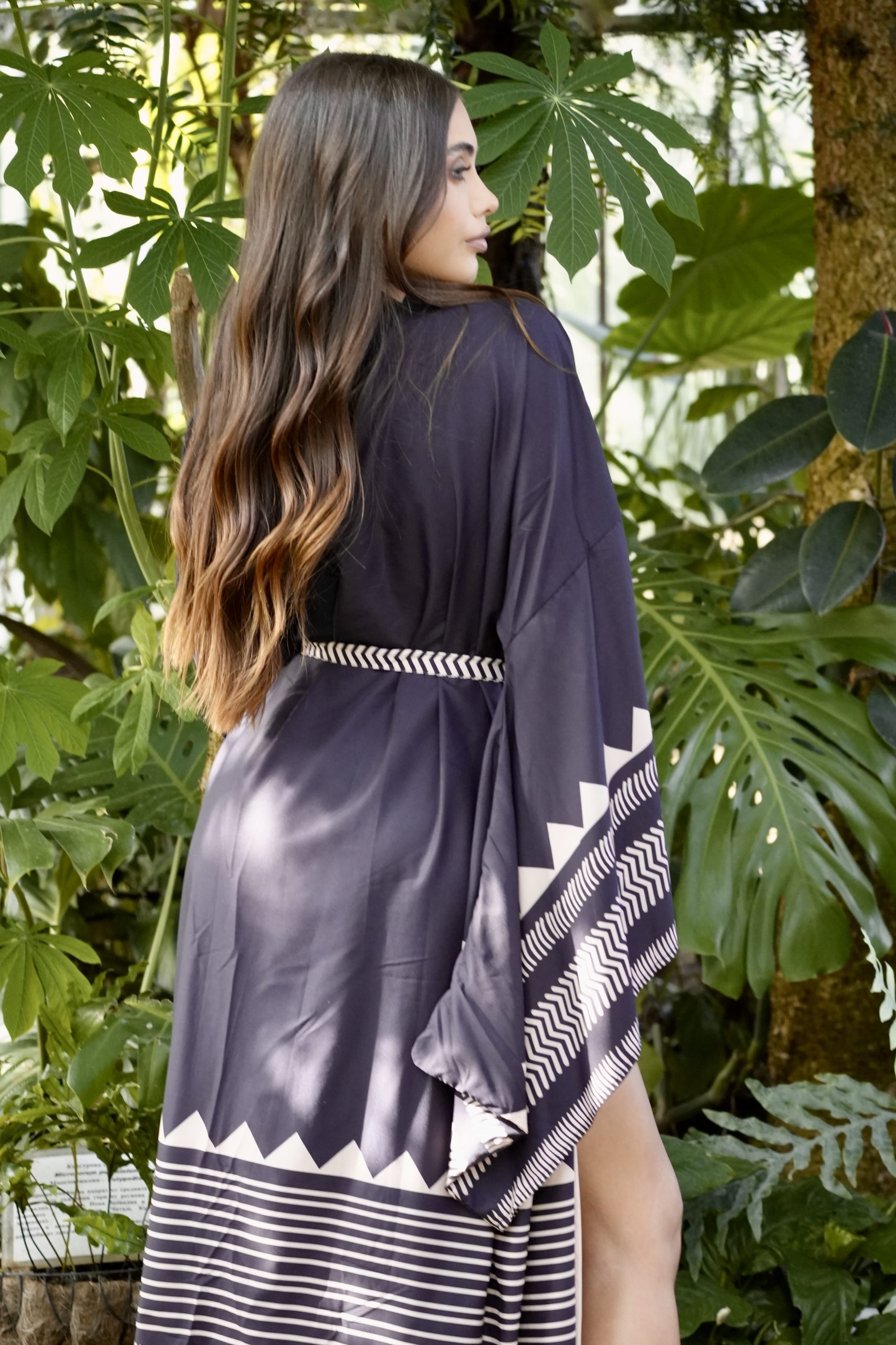 Свободно и ефирно кимоно с елегантна линия, създадено да пада леко по тялото и да придава усещане за лукс и лекота. Моделът е в наситен тъмносин нюанс, красиво допълнен от контрастни геометрични орнаменти и декоративни бордюри, които придават артистичен и авторски характер на визията. Широките ръкави и плавният силует създават усещане за движение и свобода, а фината материя го прави изключително приятно за носене в топлите летни дни.