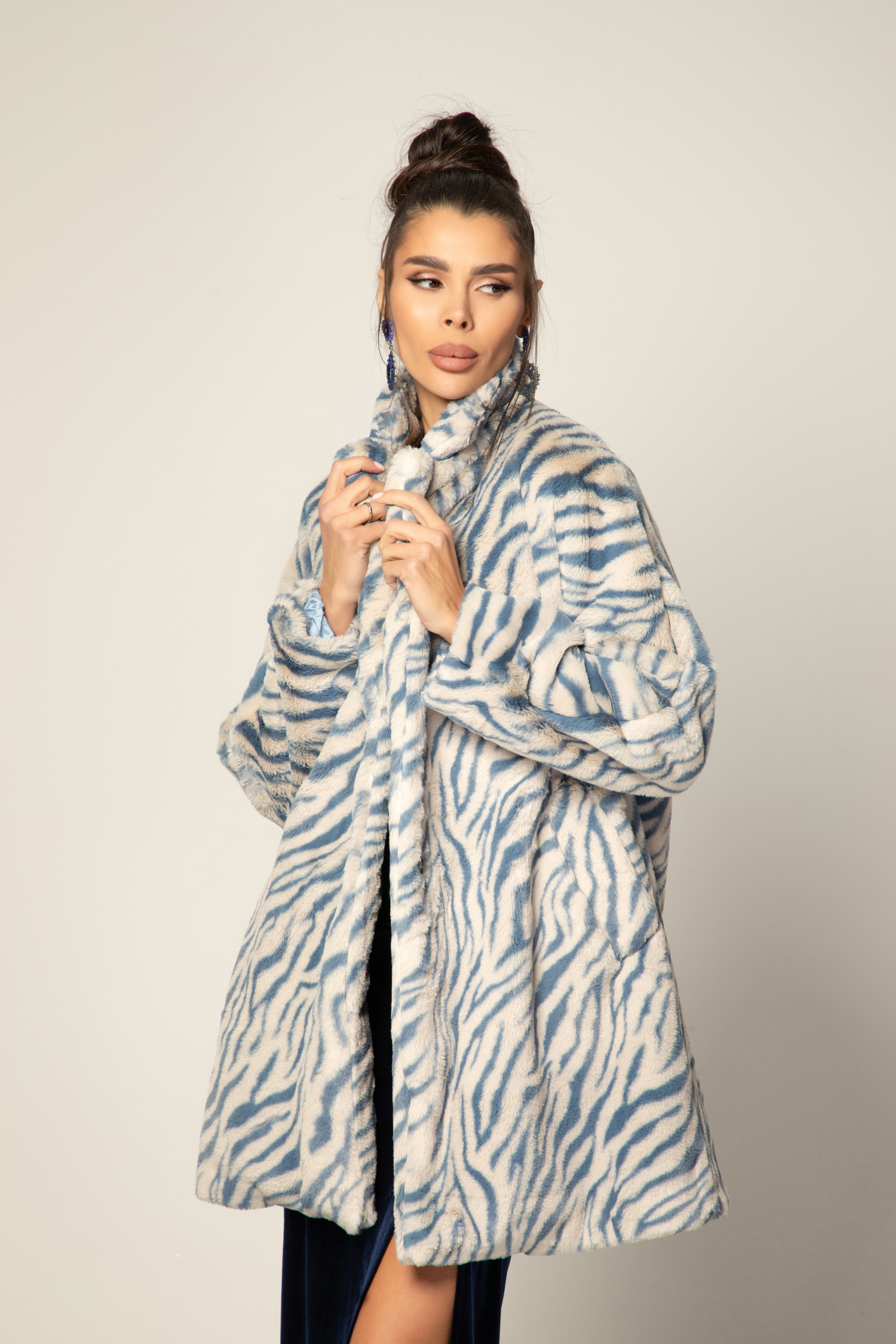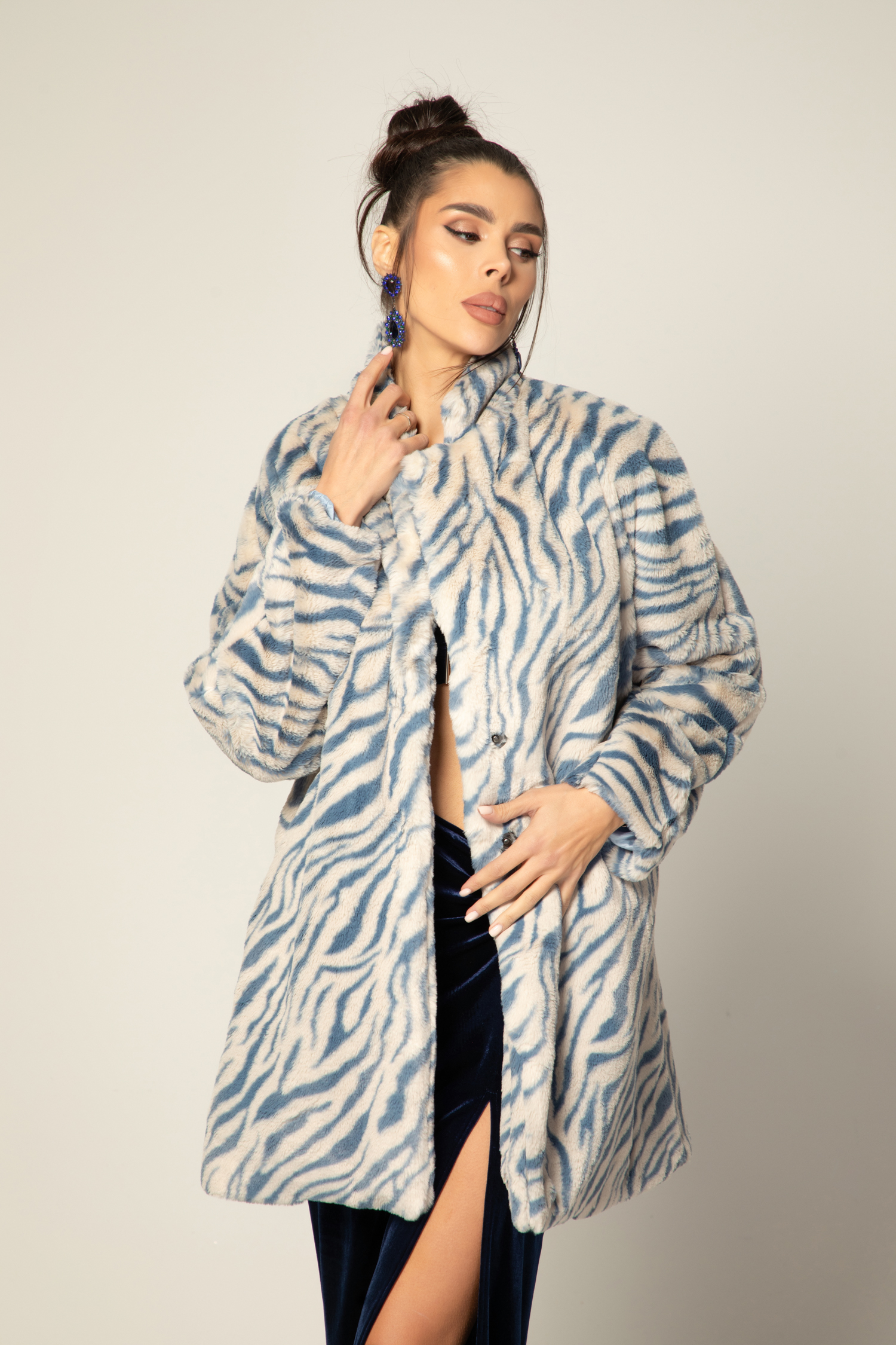 Дълго дамско палто, изработено от синтетичен астраган в комбинация от два цвята. С предно закопчаване , външни джобове и висока мека яка. Удобно и практично, подходящо за всеки тип фигура.