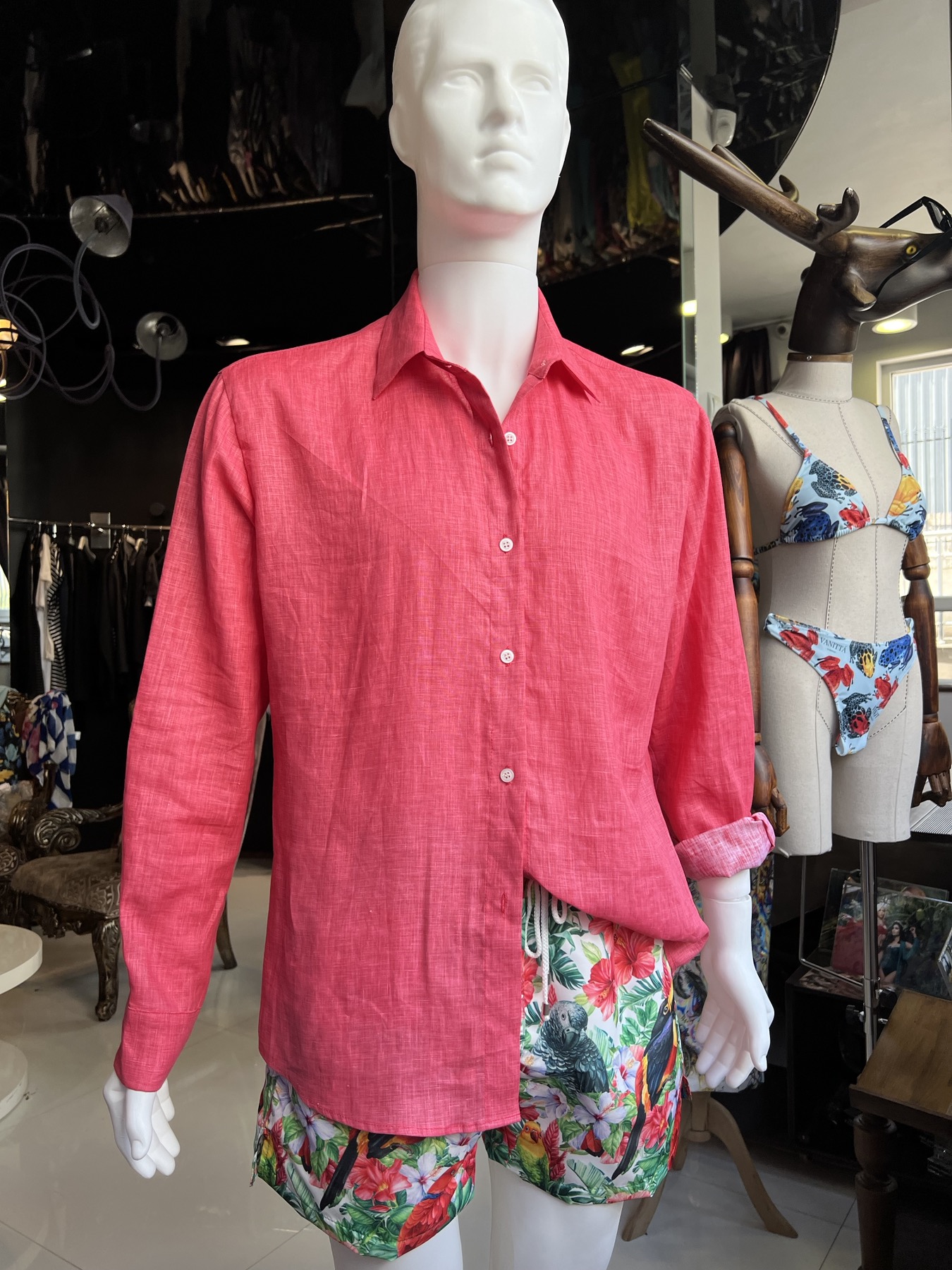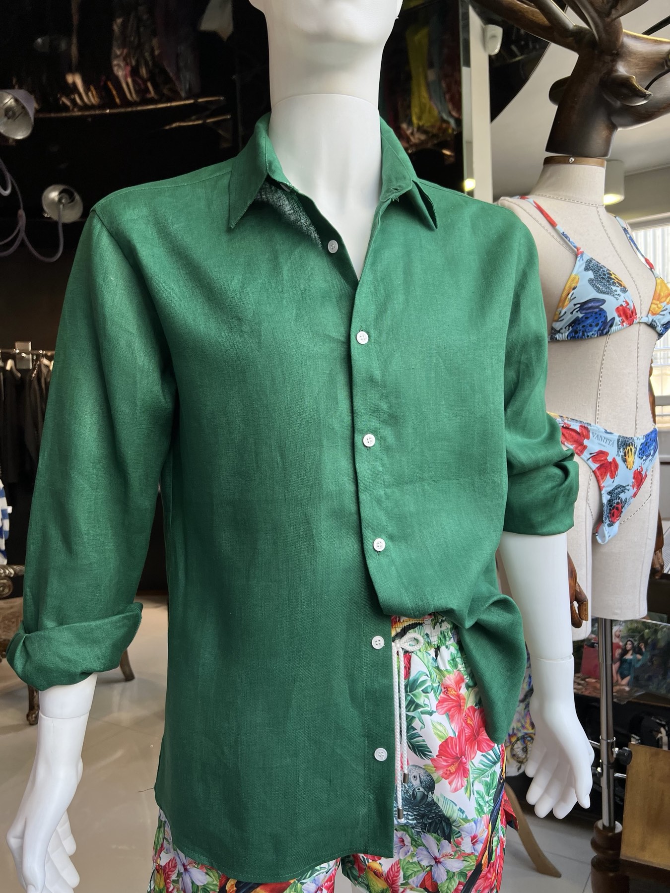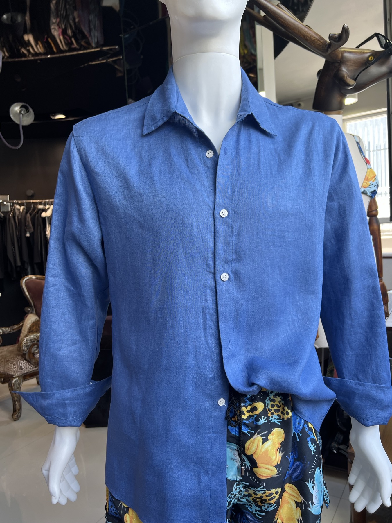 Класическа мъжка риза от 100% лен. Изчистен, силует с платка на гърба, копчета в предната част. Предлага се в наситени, ярки цветове. Вечната и предпочитана риза, задължителна за всеки пролетно-летен мъжки гардероб. Практична и лесно съчетаема.