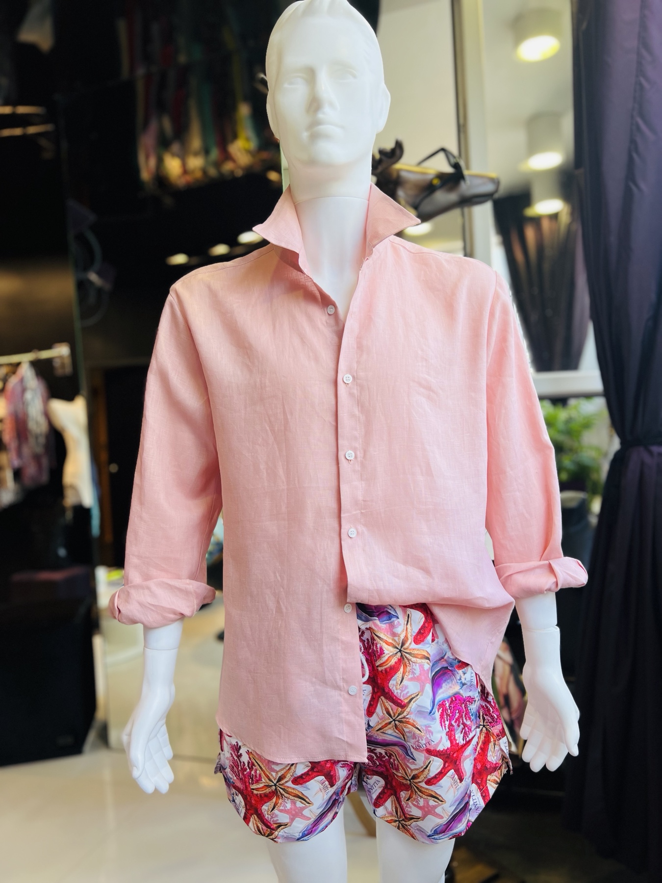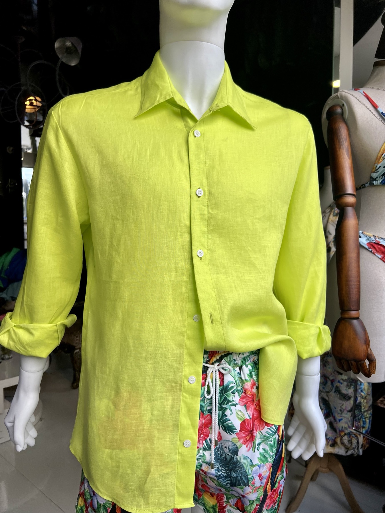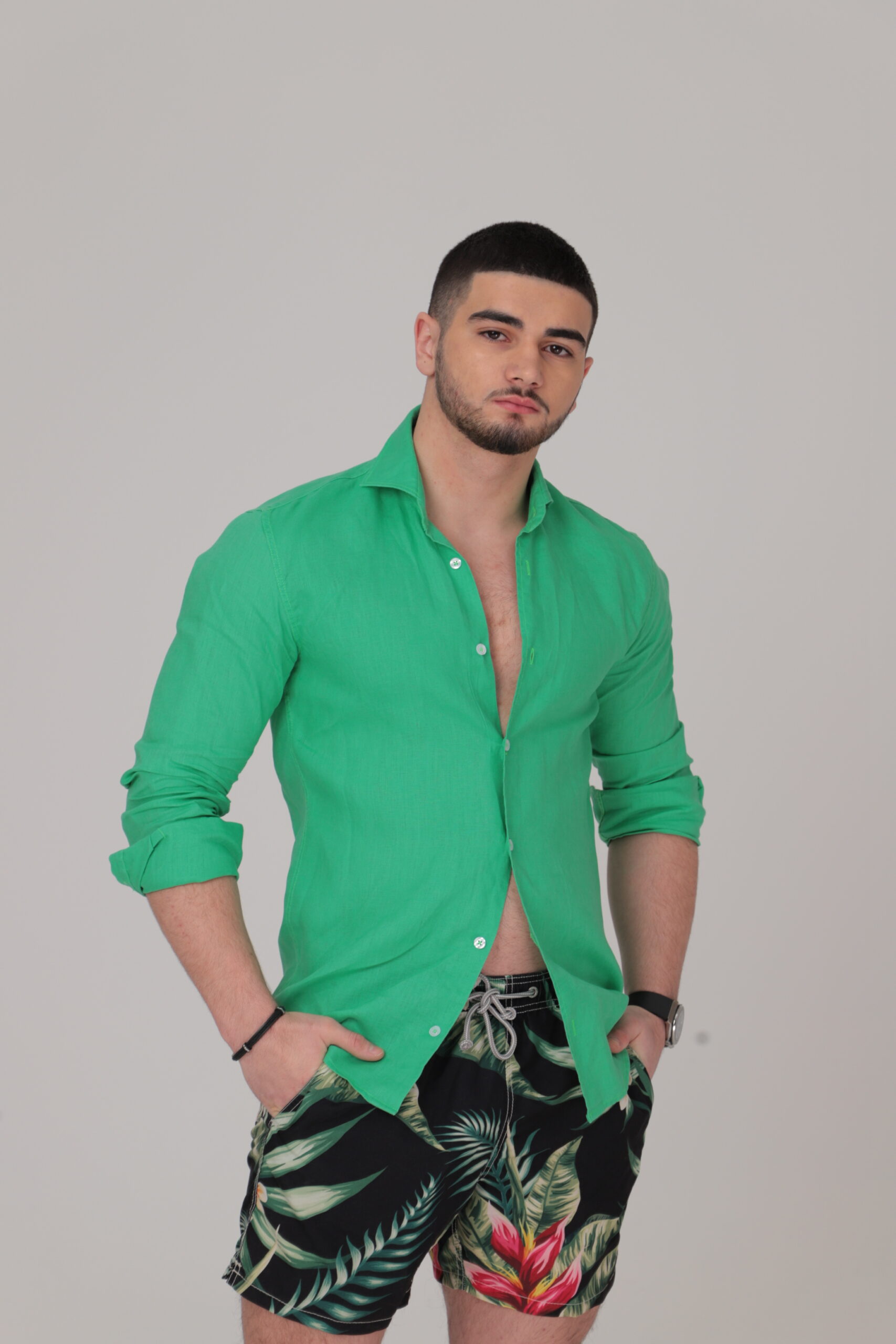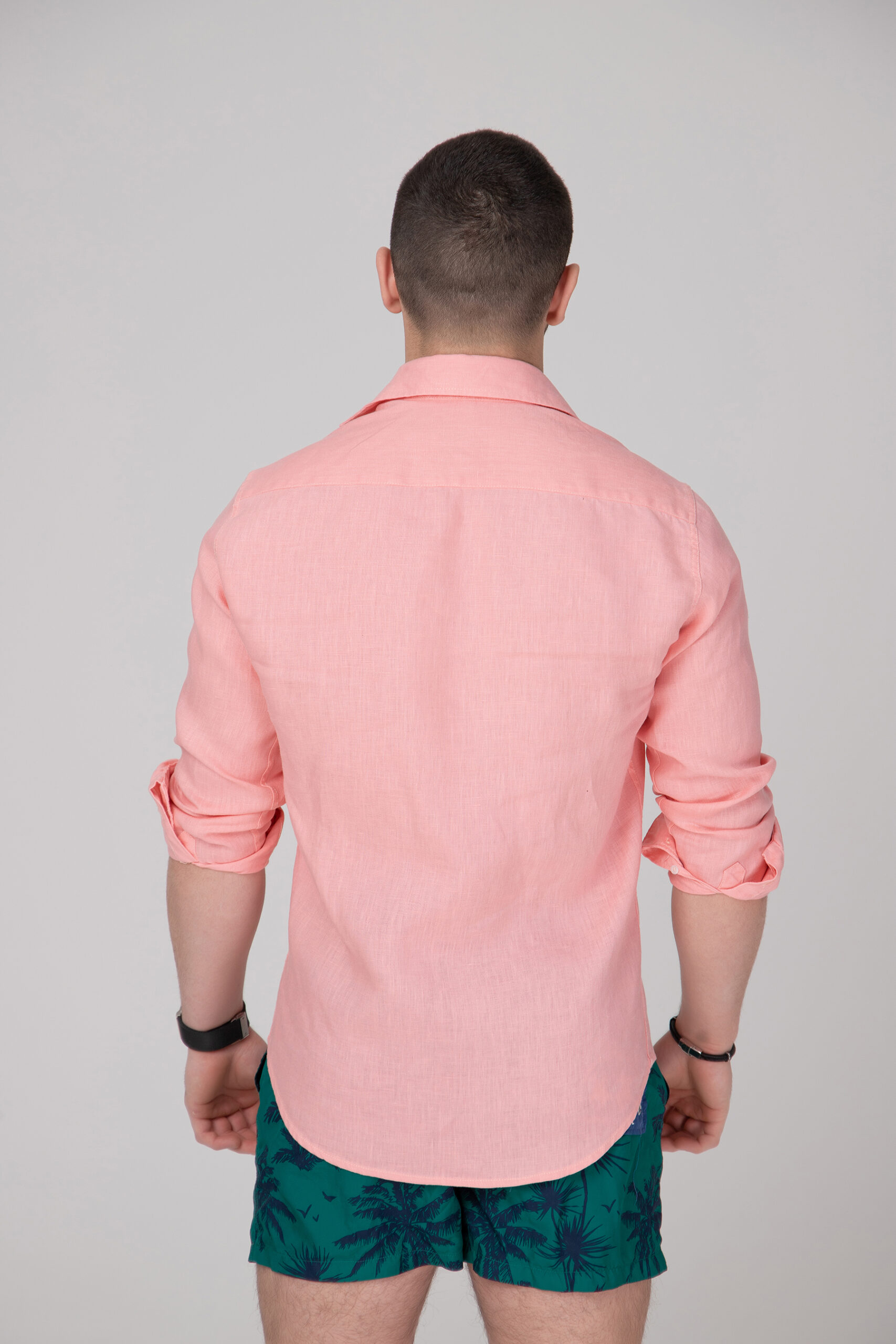 Класическа мъжка риза от 100% лен. Изчистен, силует с платка на гърба, копчета в предната част. Предлага се в наситени, ярки цветове. Вечната и предпочитана риза, задължителна за всеки пролетно-летен мъжки гардероб. Практична и лесно съчетаема.