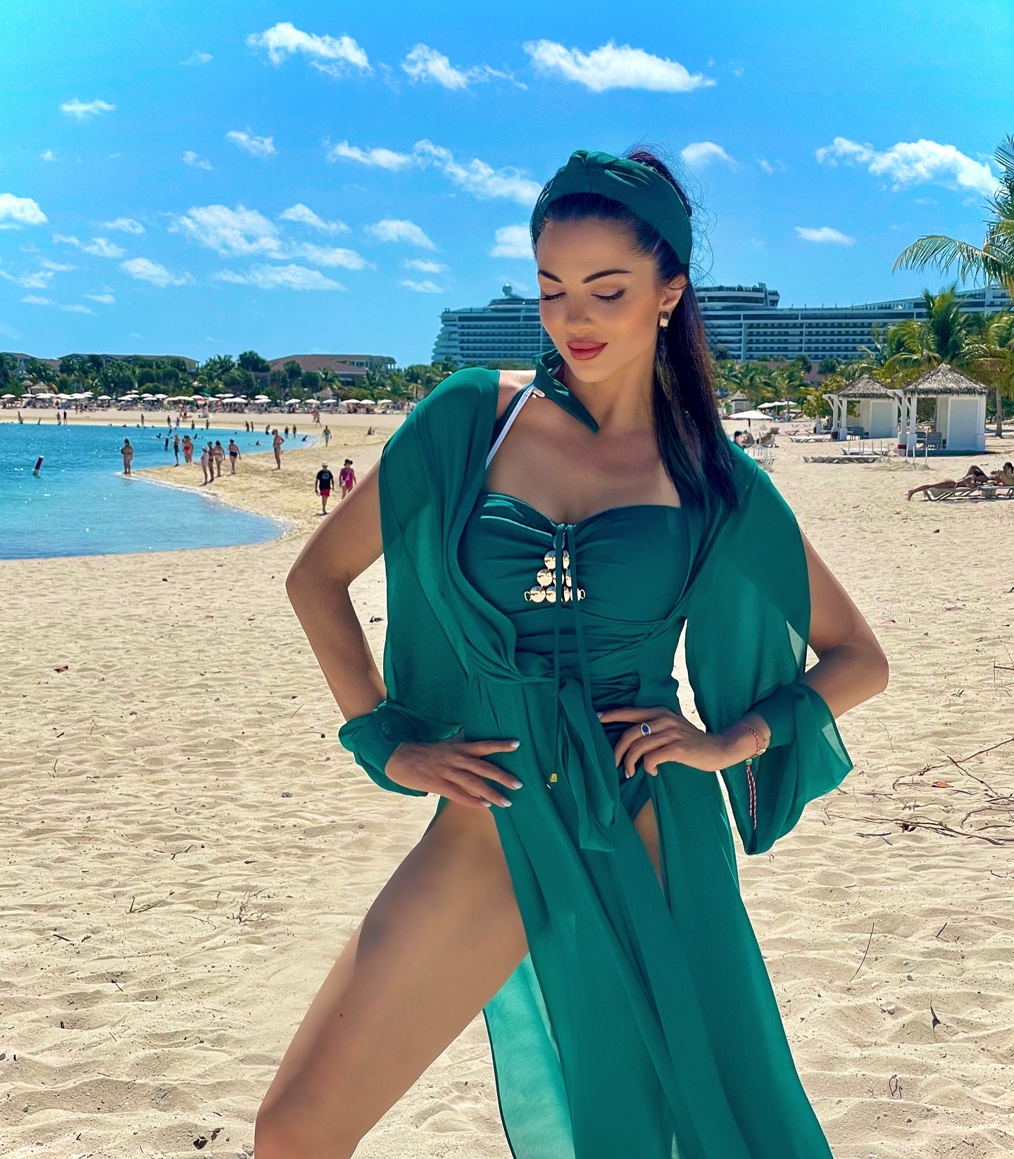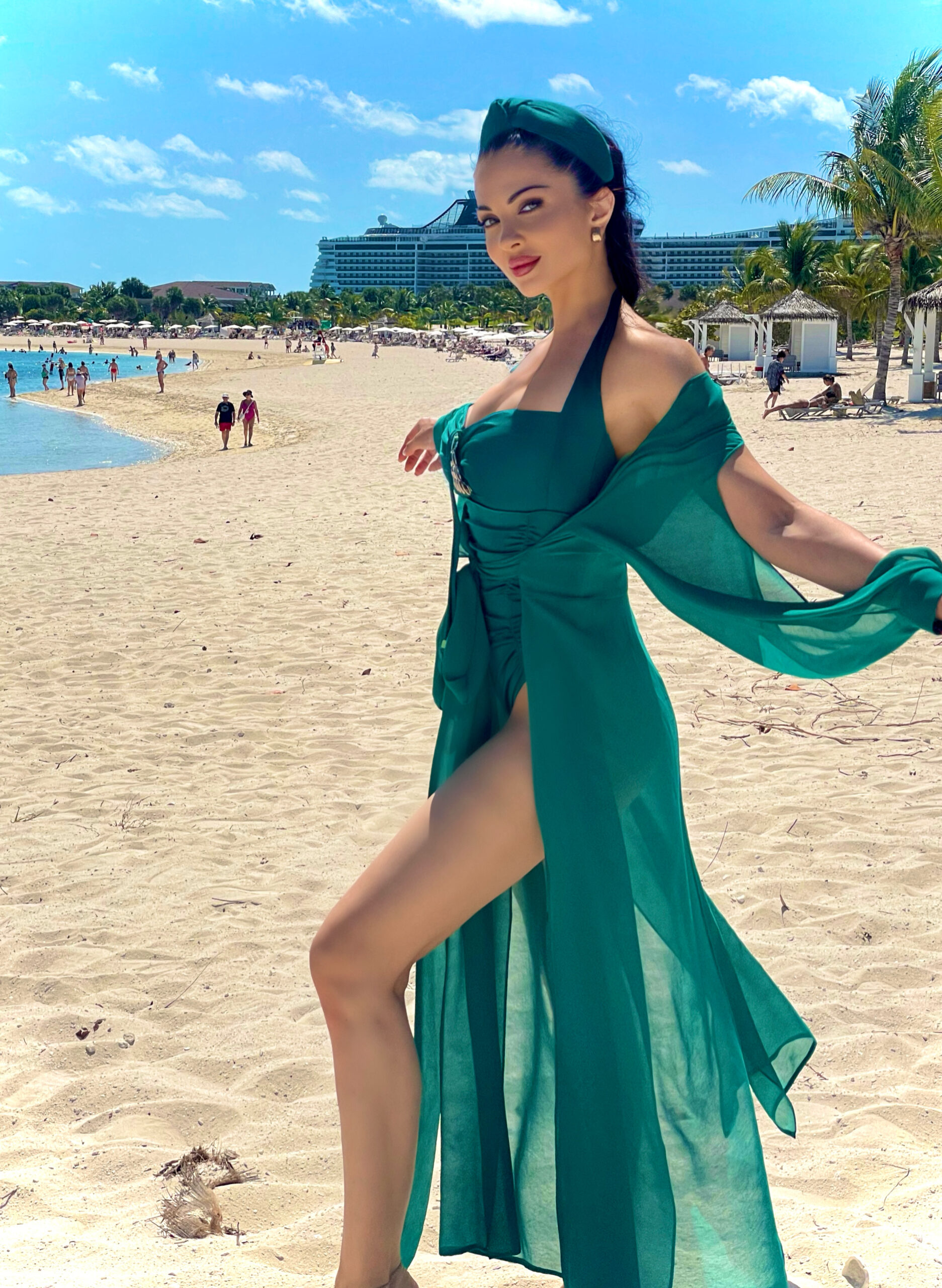 Дълга плажна рокля в актуални цветове за лятото. С колан на талията, който се връзва спрямо обиколката. Ръкавите са дълги и изрязани. Ефирна и женствена. Страхотно допълнение към плажната ви визия.