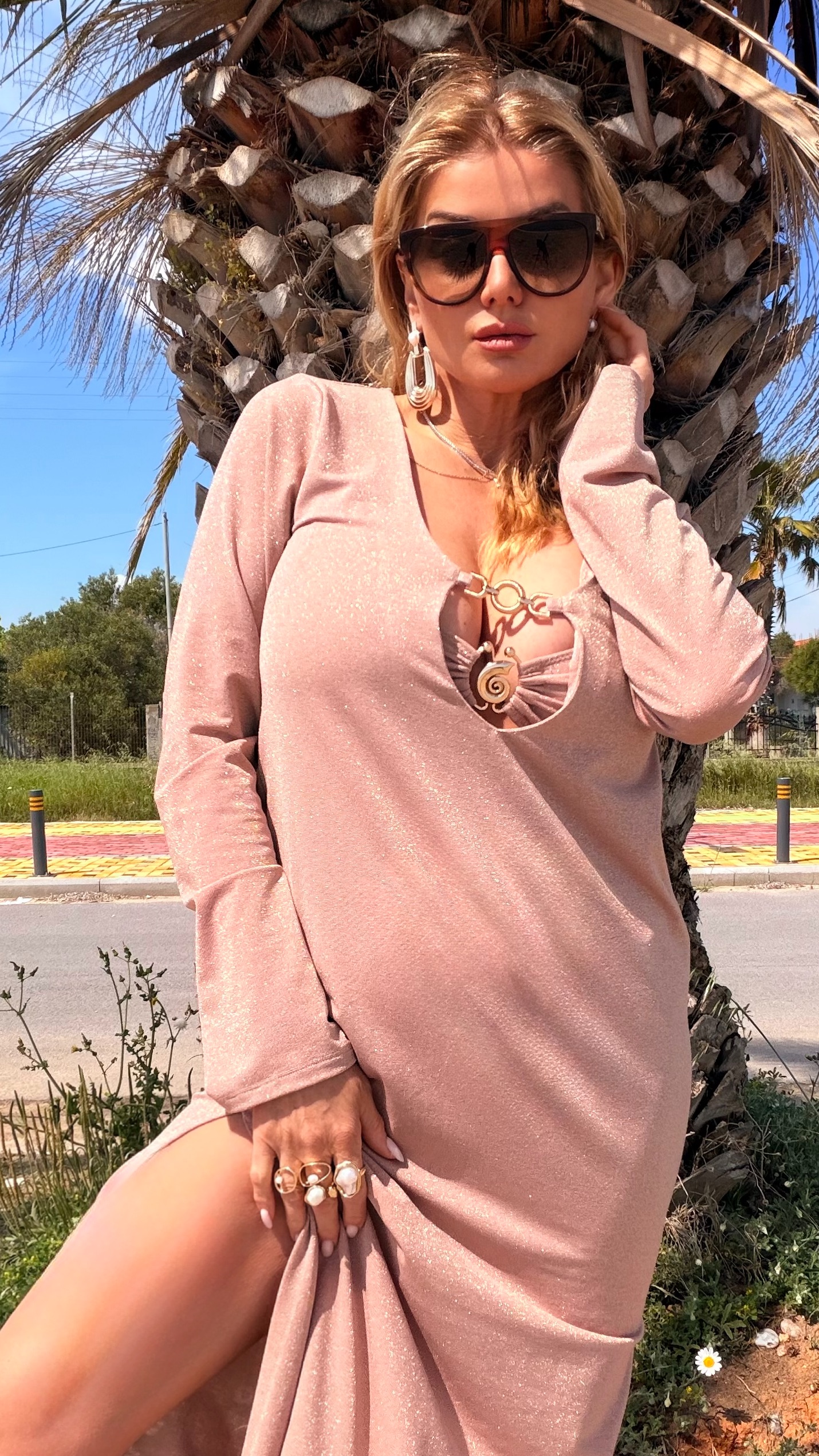 Ефирна плажна рокля в нежен нюанс златен пясък, озарена от деликатен блясък, който улавя слънцето и подчертава топлината на кожата. Материята пада меко по тялото, създавайки усещане за лекота, свобода и естествена чувственост.