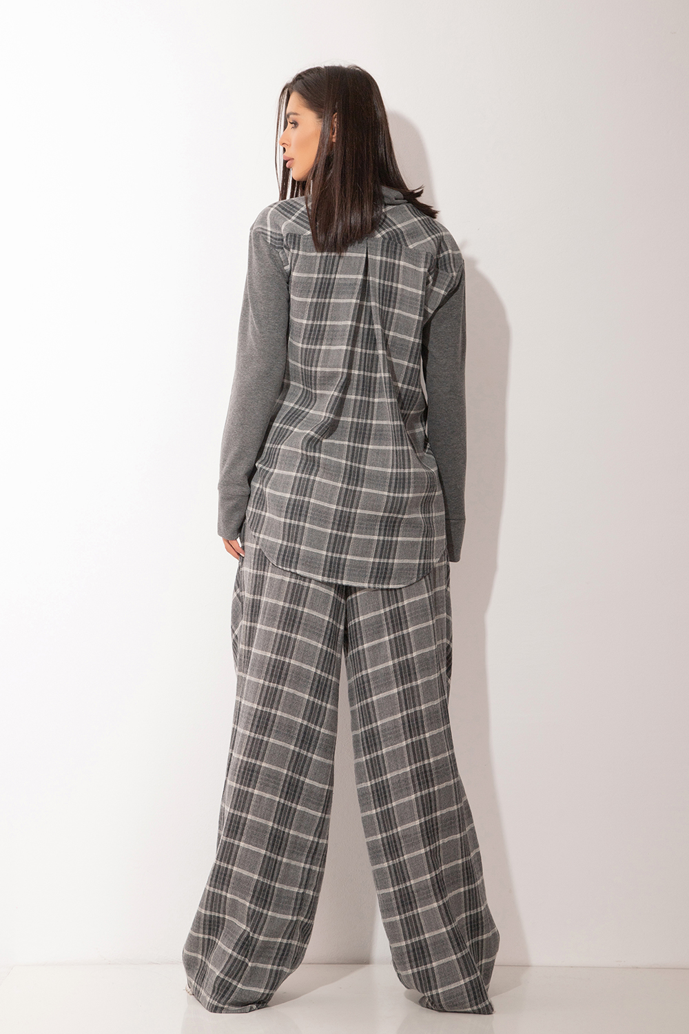 Спортно-елегантен сет, състоящ се от широк кариран панталон от 100% вълна и широка спортна блуза с джобче в предната част.