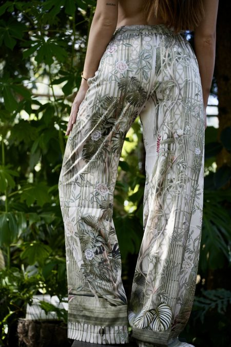 Свободен плажен панталон от фин сатен с авторски тропически принт. Моделът е с удобен ластик в талията, който осигурява комфорт и лекота при носене. Кройката е свободна и ефирна, което придава елегантно движение и усещане за ваканционен шик. Идеален за съчетаване с кимоното за завършена и стилна resort визия.